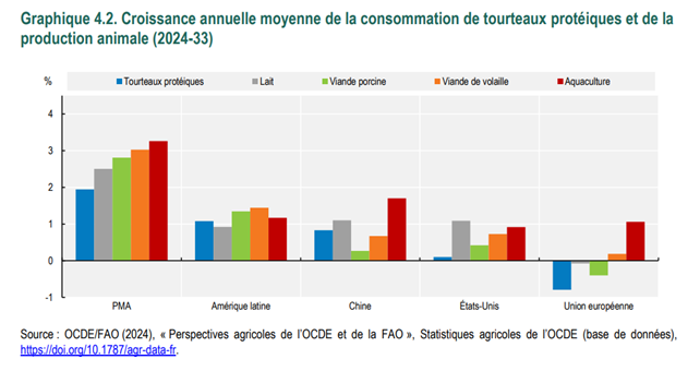 El crecimiento en la producción de otras semillas oleaginosas (colza, girasol y cacahuete) también se desacelerará al 0,8% anual, en comparación con el 2,9% anual durante los últimos diez años (2014-2023). Los mayores productores de otras semillas oleaginosas son China (principalmente colza y cacahuete) y la Unión Europea (principalmente colza y girasol). Se espera que su producción anual alcance los 41 millones de toneladas y los 30 millones de toneladas respectivamente en 2033. Sin embargo, se espera que el crecimiento sea limitado (0,8% anual en China y 0,2% anual en la Unión Europea) debido al aumento de los precios de los cereales, lo que creará una fuerte competencia entre los dos tipos de cultivos, dada la limitada superficie cultivable. Se espera que Ucrania y Rusia, ambos grandes productores de colza y girasol, experimenten aumentos en la producción de otras semillas oleaginosas, superando los 20 millones de toneladas anuales para 2033.