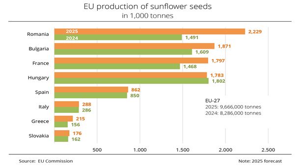 La Comisión Europea proyecta una cosecha de semillas de girasol de 9,7 millones de toneladas para 2025. Esto representaría un aumento del 17 por ciento respecto al año anterior, cuando los rendimientos decepcionantes limitaron la producción.