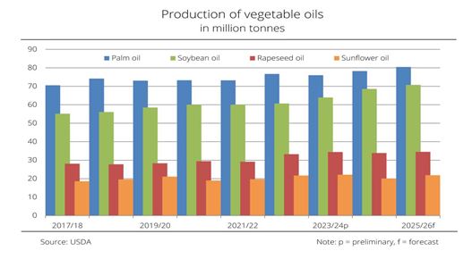 Según las últimas previsiones publicadas por el Departamento de Agricultura de Estados Unidos (USDA), se espera que la producción mundial de aceites vegetales en 2025/26 alcance los 234,5 millones de toneladas. Esto representaría un aumento de 6,7 millones de toneladas en comparación con 2024/25. En otras palabras, la producción podría cubrir la demanda proyectada de 228,9 millones de toneladas. Se estima que la producción de aceite de semillas de girasol crecerá alrededor de 1,8 millones de toneladas a 21,9 millones de toneladas, principalmente debido a una mayor producción en Ucrania y la UE-27.