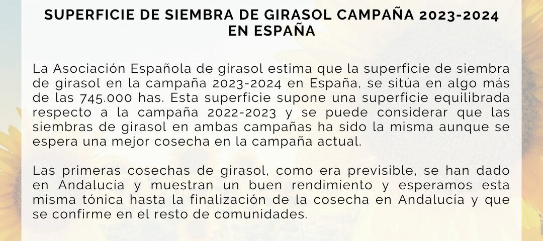 La Asociación Española de girasol estima que la superficie de siembra de girasol en la campaña 2023-2024 en España, se sitúa en algo más de las … Sigue leyendo Superficie de siembra de girasol campaña 2023-2024 en España