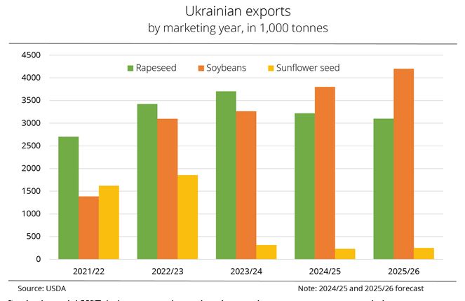 Ucrania mantuvo su posición como principal productor mundial de semillas de girasol en la temporada 2024/25. Si bien la cosecha de 13 millones de toneladas fue aproximadamente 2,5 millones de toneladas menor que la de la temporada anterior, Ucrania se mantuvo como el segundo productor mundial más importante, después de Rusia, y por delante de la UE. Al mismo tiempo, la cuota de exportación de semillas de girasol disminuyó considerablemente interanualmente. Si bien en la temporada 2022/23 se comercializaron casi 1,9 millones de toneladas en el mercado mundial, la cifra se redujo a tan solo 230.000 toneladas en la temporada 2024/25. El Departamento de Agricultura de Estados Unidos (USDA) estima que las exportaciones se mantendrán bajas durante la temporada actual, alcanzando las 250.000 toneladas.
