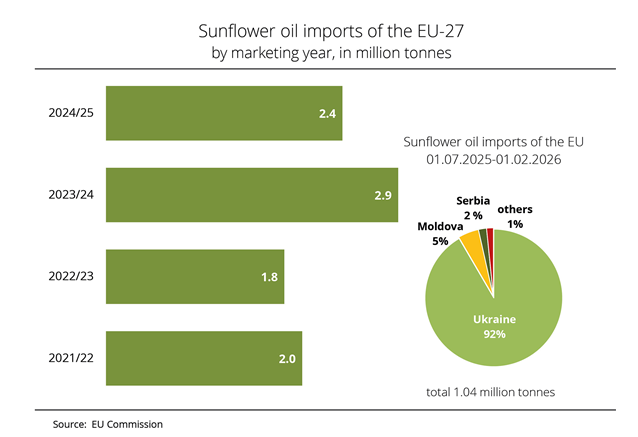 Del 1 de julio de 2025 al 1 de febrero de 2026, la UE-27 importó poco menos de 1,04 millones de toneladas de aceite de girasol, lo que representa una disminución respecto a los 1,28 millones de toneladas del mismo período del año anterior. Ucrania es, con diferencia, el principal país de origen, con 0,95 millones de toneladas de aceite de girasol importadas a la UE en lo que va de temporada.